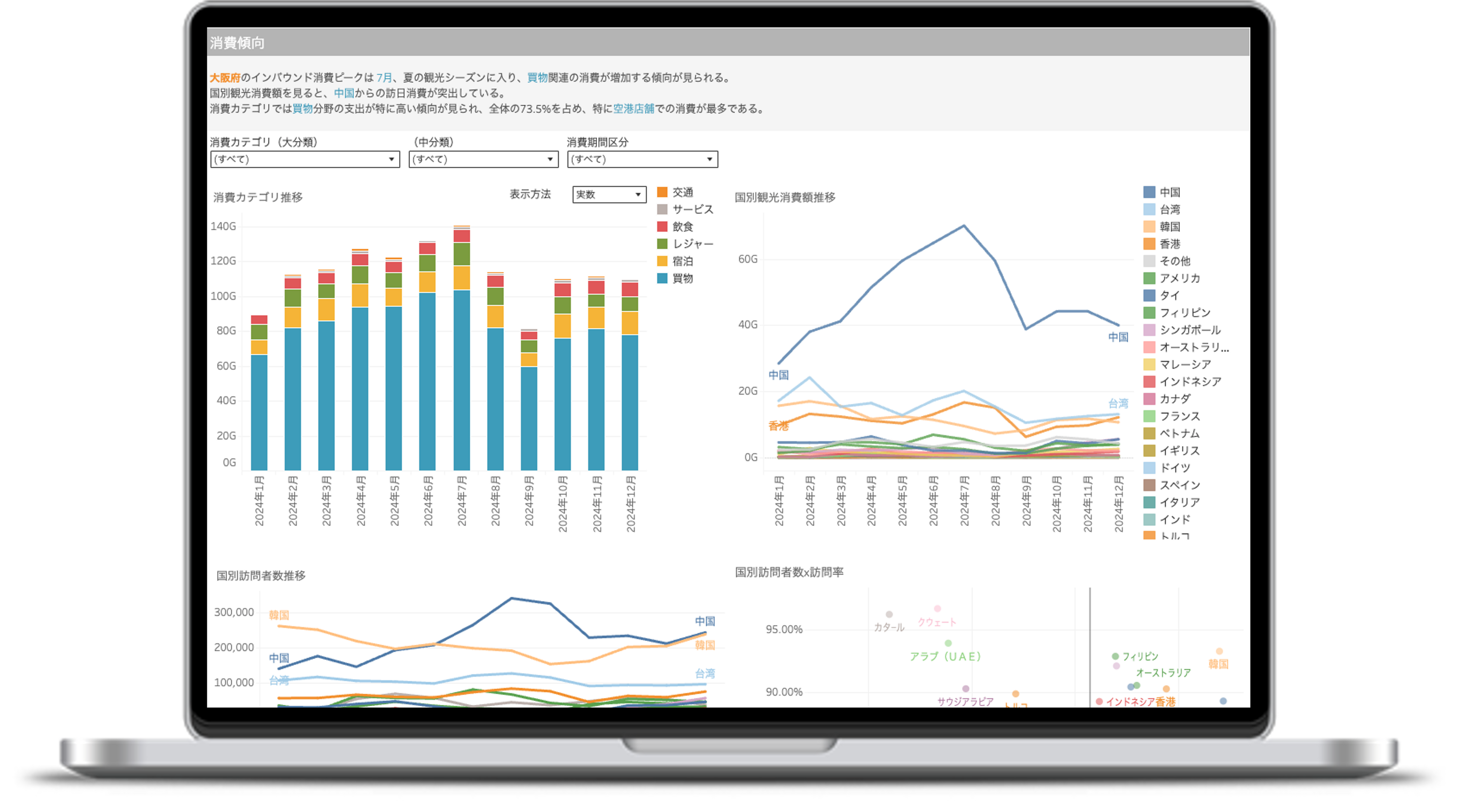 43市町村が共通して利用できるKPI体系を策定し、観光消費額・訪問者属性・旅マエ/旅ナカ行動・宿泊者数などの主要データを統合。自治体間比較、年次推移、ターゲットセグメント分析などを“迷わず実行できる”環境を整備。