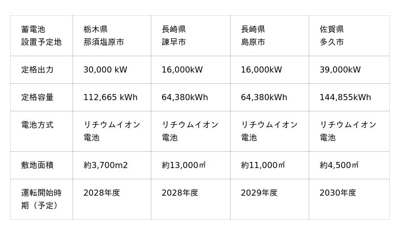 東京センチュリー株式会社(本社:東京都千代田区、代表取締役社長:藤原 弘治、以下「当社」)は、自社単独で出資・開発を行う特別高圧※系統用蓄電池事業(合計定格出力101MW)を国内4カ所(栃木県那須塩原市、長崎県諫早市、長崎県島原市、佐賀県多久市)において実施することを決定しました。