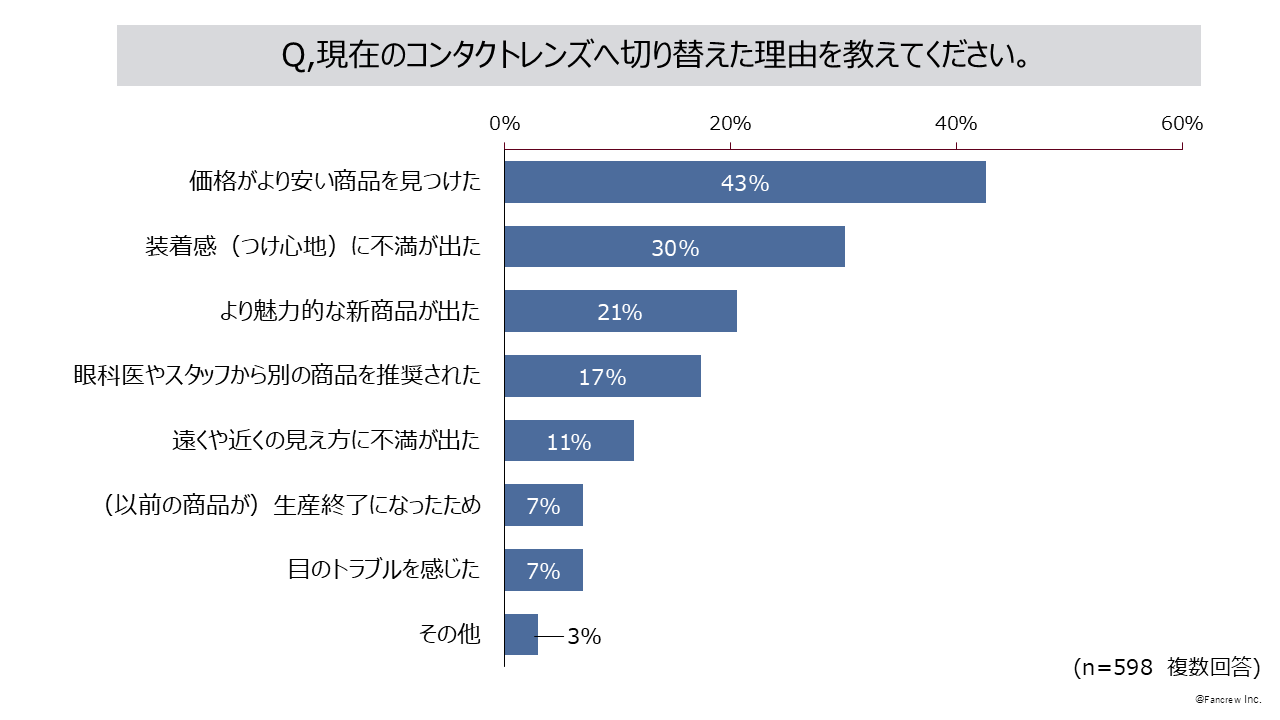 2.現在のコンタクトレンズへ切り替えた理由は「価格がより安い商品を見つけた」43%