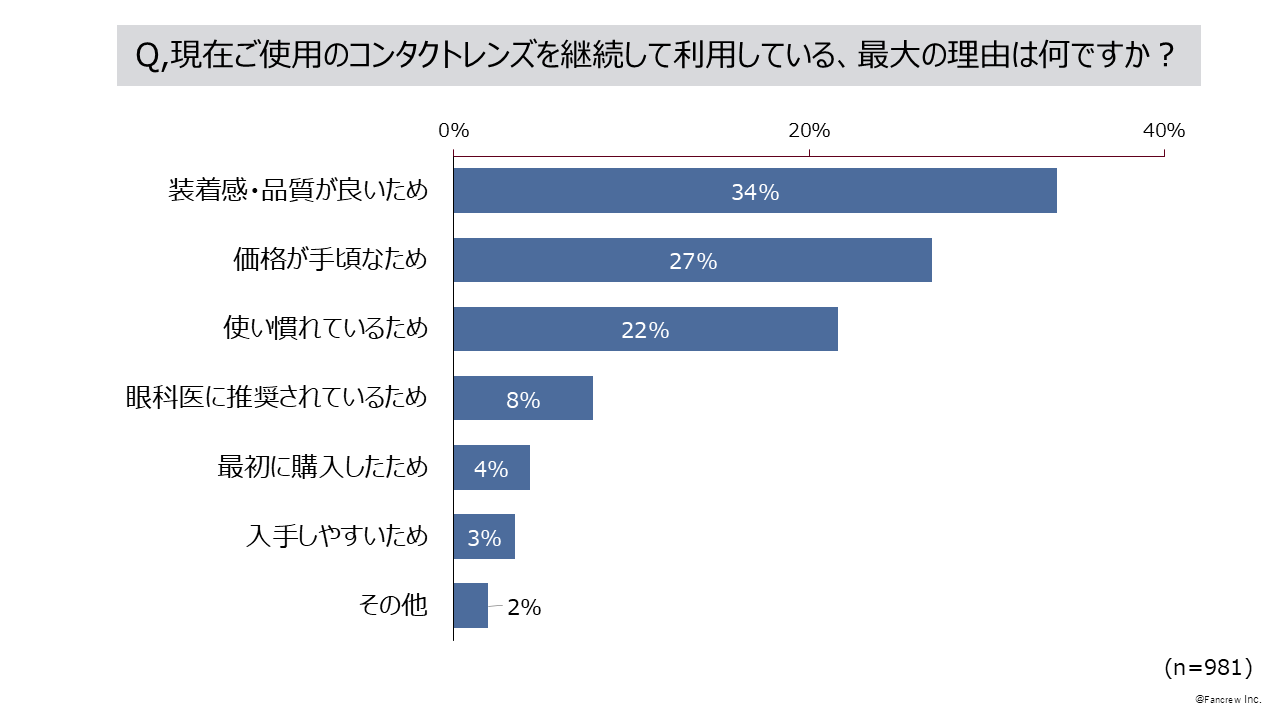 3.現在使用中のコンタクトレンズを継続している利用している最大の理由は「装着感・品質が良いため」34%