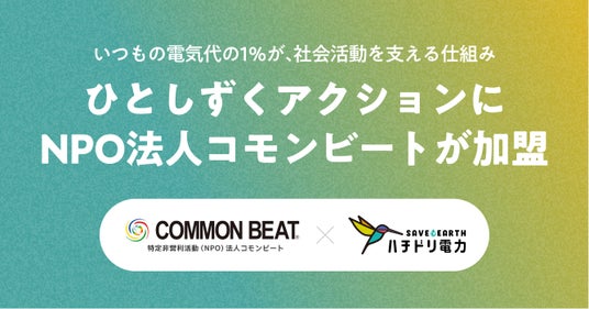 株式会社ボーダレス・ジャパン(本社:福岡県福岡市、代表取締役CEO:田口一成)が運営する、自然エネルギー100%の電気のみを届ける電力会社「ハチドリ電力」は、電気代の1%が自動的に社会活動への寄付となる取り組み「ひとしずくアクション」に、新たにNPO法人コモンビートが加盟したことをお知らせいたします。