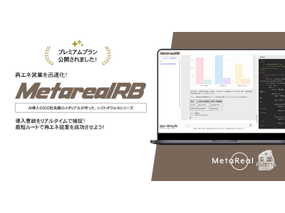 メタリアル・グループの株式会社ロゼッタ(代表取締役:五石 順一)は、企業向け再生可能エネルギー導入ニーズ予測AIエージェント「Metarealリニューアブルインサイト」(以下、Metareal RB)のプレミアムプラン(月額5万円(税込)、1日20回・月200回利用可能)を2025年12月12日(金)より提供開始しました。