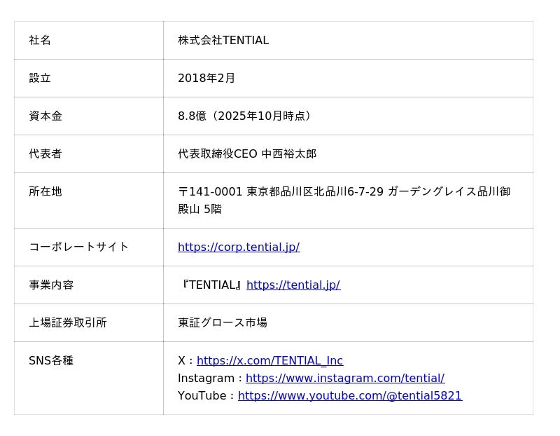 コンディショニングブランド『TENTIAL』は、アスリートの知見と最新技術・研究に基づき、機能性を追求した製品・サービスを提供。24時間365日、日常生活のあらゆるシーンで心身を整え、疲労回復やパフォーマンス向上をサポートするコンディショニング活動を推進しています 。すべては個人のコンディションとポテンシャルを引き出すという信念のもと、株式会社TENTIALは、健康に前向きな社会の実現のため、コンディショニングの社会実装に取り組んでまいります。
