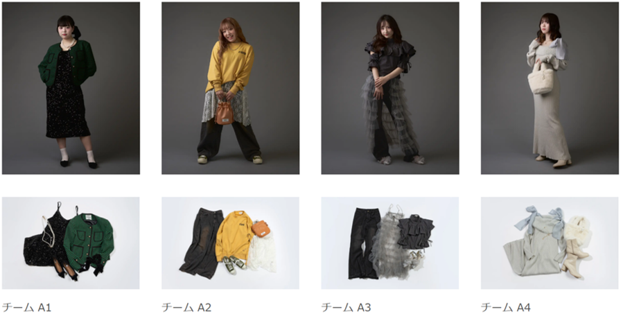チーム A4:「上品さ」と「高級感」を意識したコーディネート。小物にブランドアイテムを取り入れることで、コーディネート全体の質感を引き上げ、古着を上手く使ってコストを抑えつつ、上品で統一感のあるスタイルに仕上げました。
