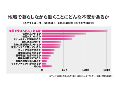 この傾向は「スマウト」のユーザーにおいても顕著です。カヤックが2025年8月に実施した「スマウト」ユーザーへのアンケート調査では、地域に興味がある50代以上、235名のうち93.6%が、移住や二地域居住先での就業を希望していることがわかりました。しかし、「年齢を受け入れてくれるか不安」(152件)、「仕事が見つかるか不安」(102件)といった声も多く、意欲と不安が混在しているのが現状です(※4)。