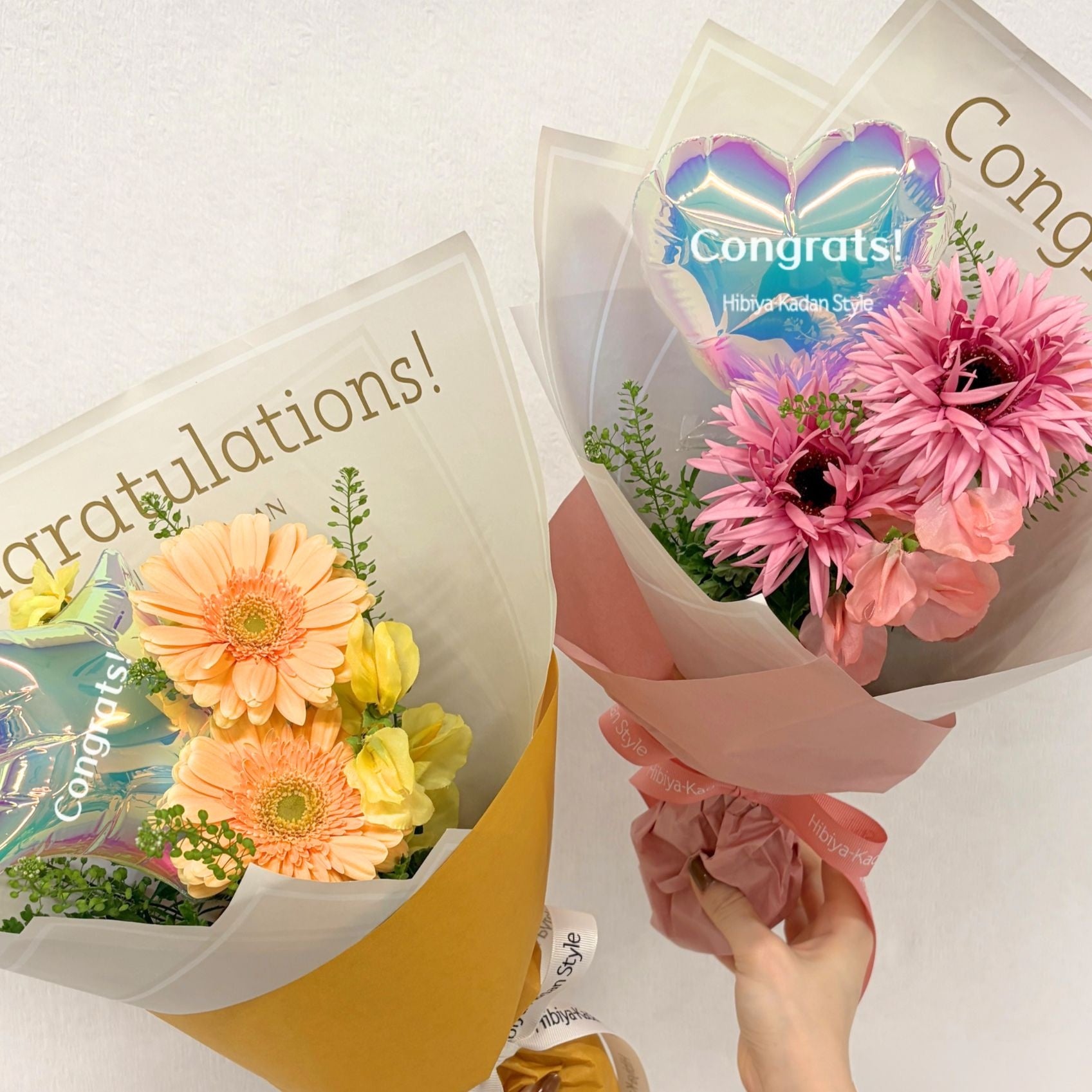 花束「my bestie!」には、写真映えする「Congrats!」のメッセージ入りオーロラカラーのバルーンが入っています。