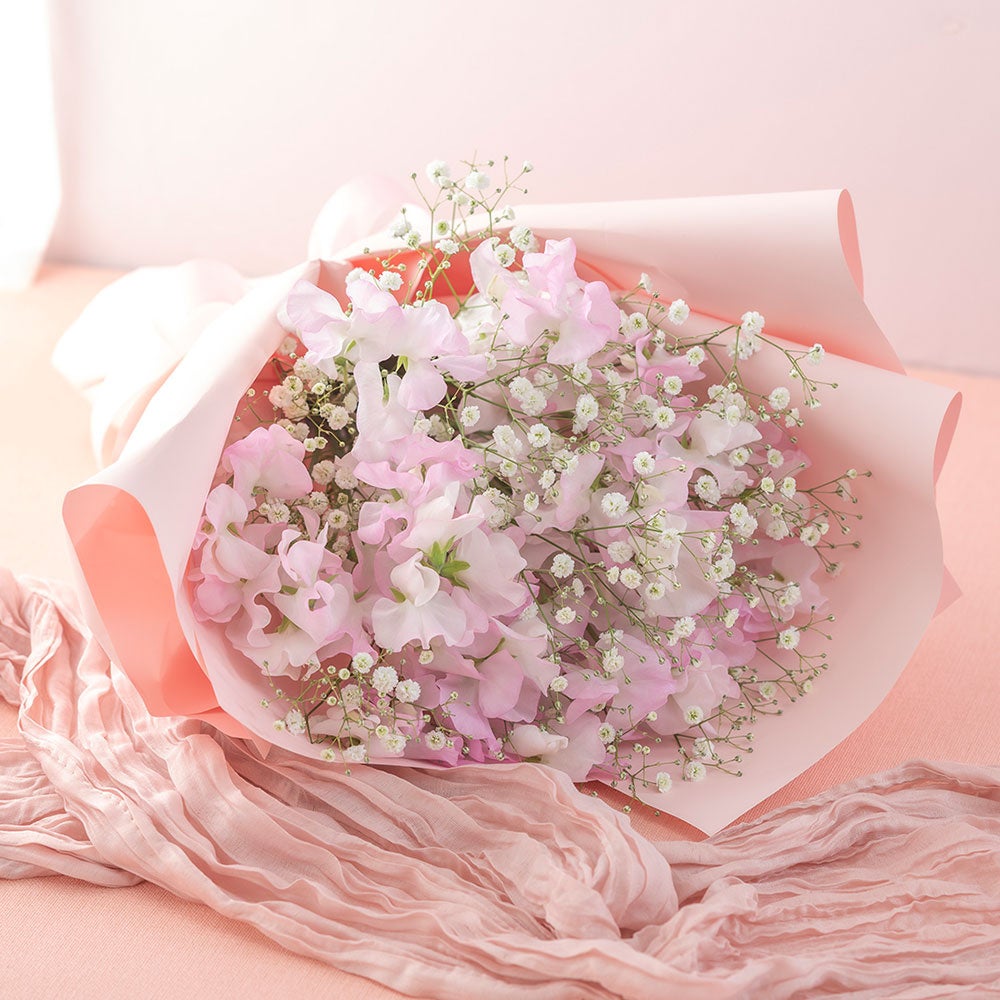 ひらひらと舞う蝶のような花姿から、飛び立つ、旅立ちといった新たなスタートにぴったりの意味合いを持っています。20本のスイートピーのブーケは、新成人として社会へ羽ばたき、活躍してほしいというエールを贈るのに最適です。これまでの優しい思い出を胸に、未来へ向かって軽やかに進んでいく姿を祝福します。可愛らしい姿と甘い香りが、ハレの日を最高に彩ります。