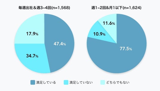・週3~4回以上の出社における満足度は約半数、週1~2回以下の満足度は8割近くにのぼる
