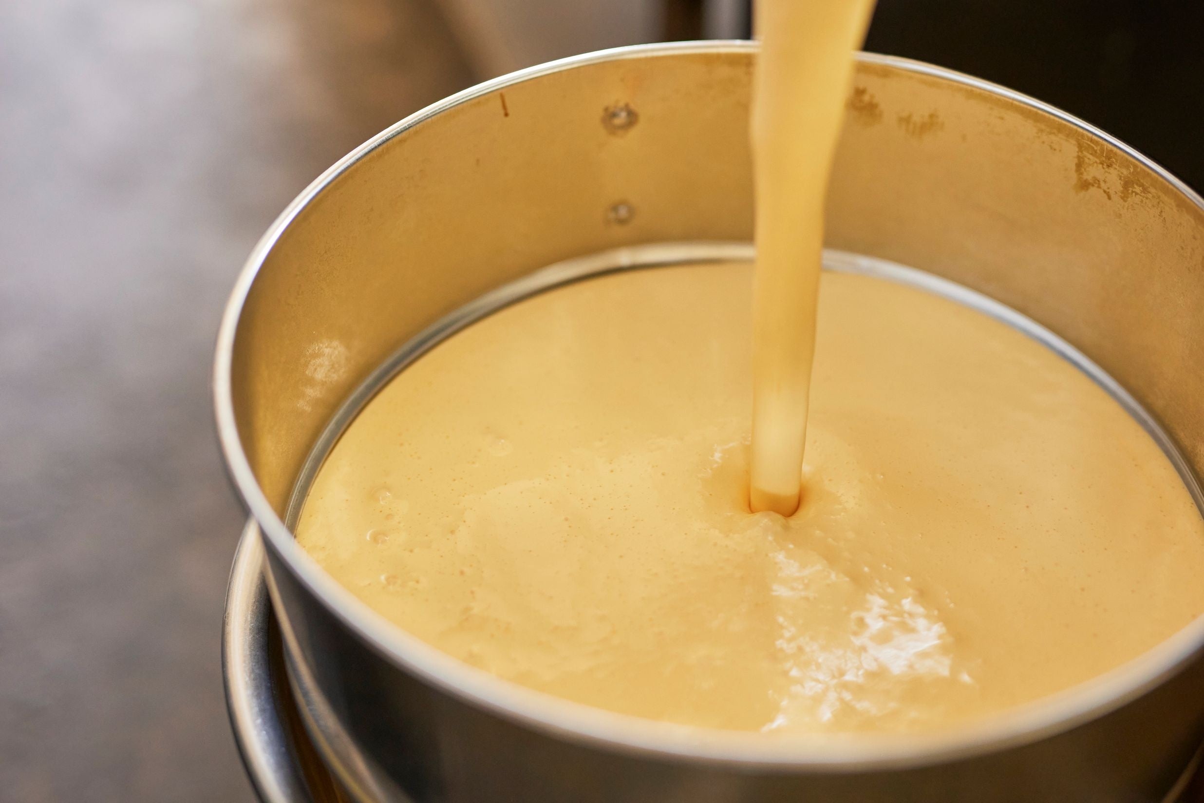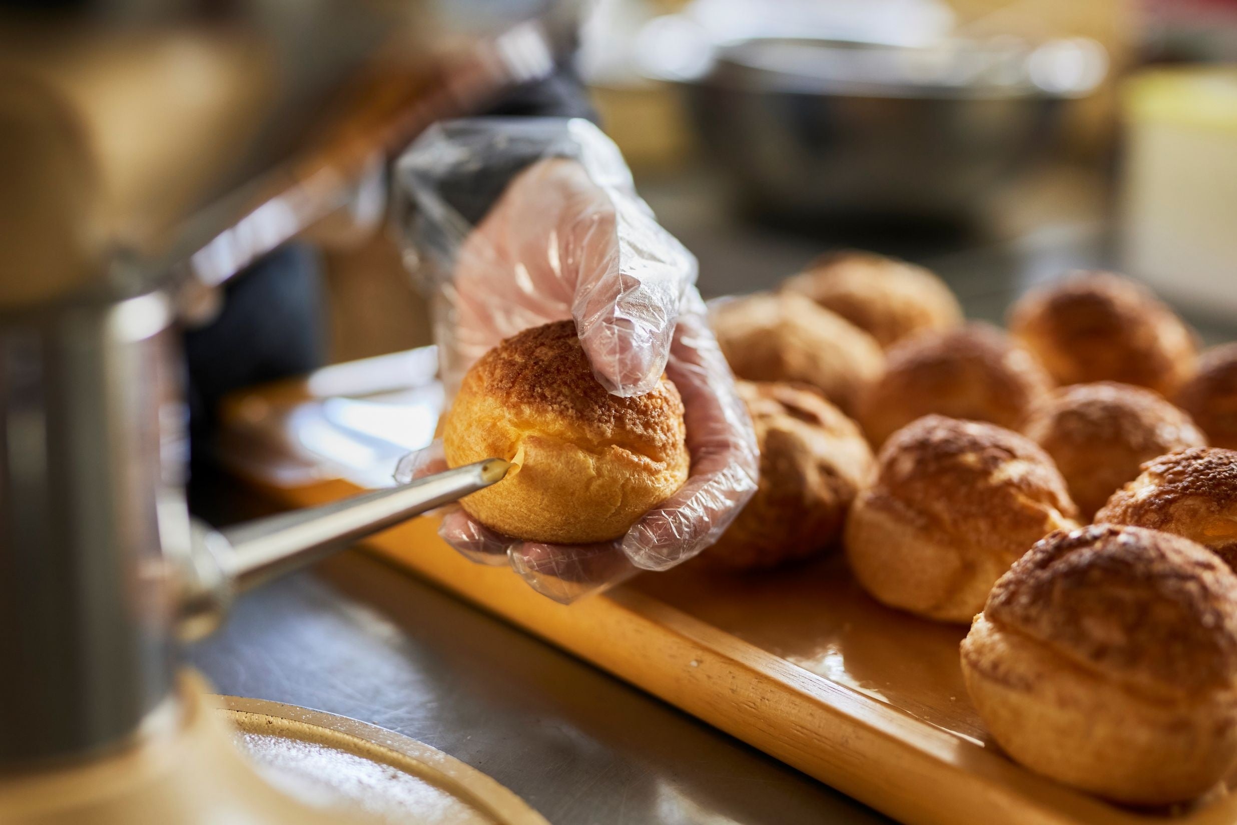 シュー生地は2種類あり、何層にも重なるパリパリの生地が特徴の「パイシュー」と頬張るとサクッとこぼれる「サブレシュー」。サクサク焼き立ての生地に、朝一手炊きの特製カスタードクリームを詰め、急速冷凍しています。