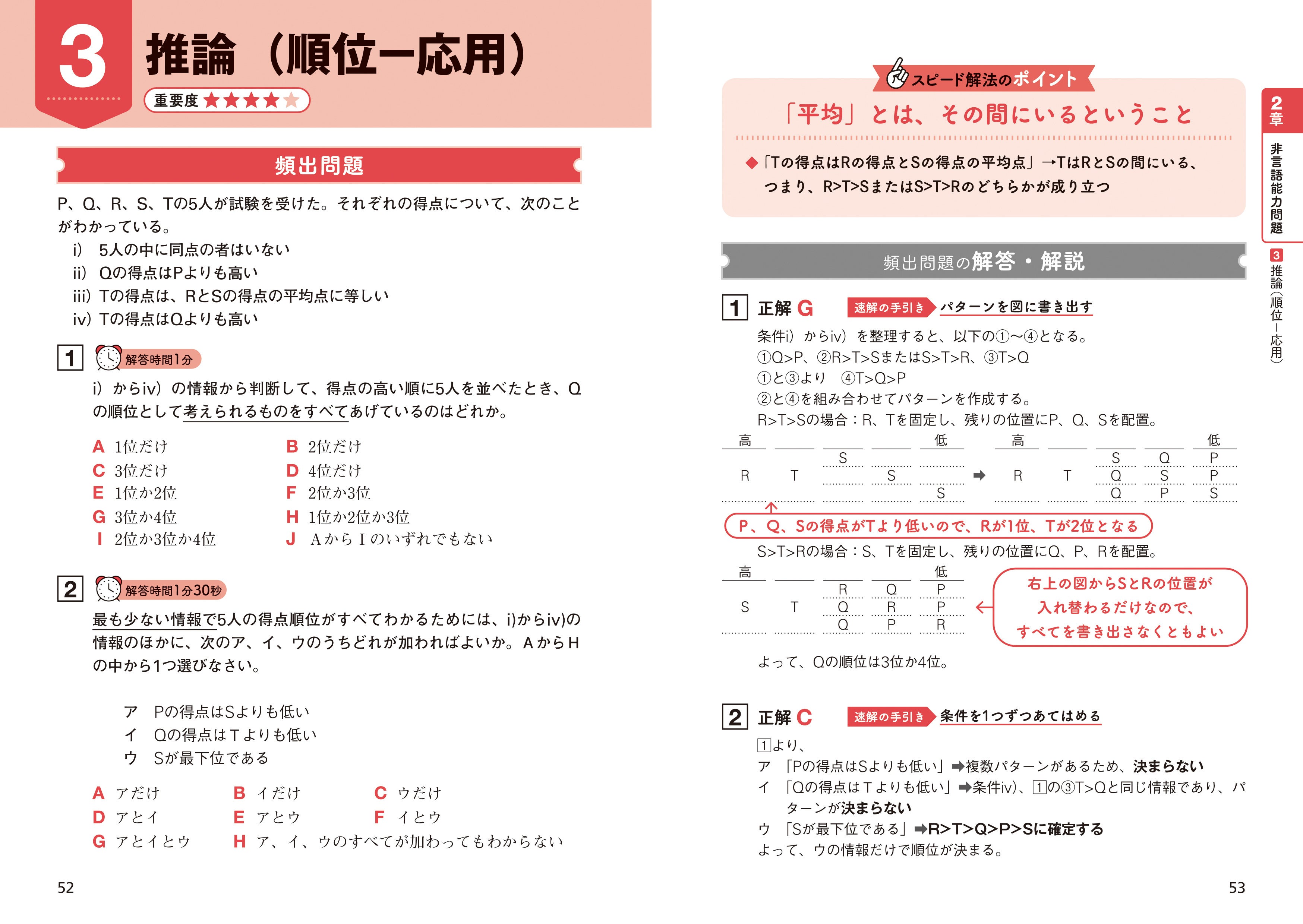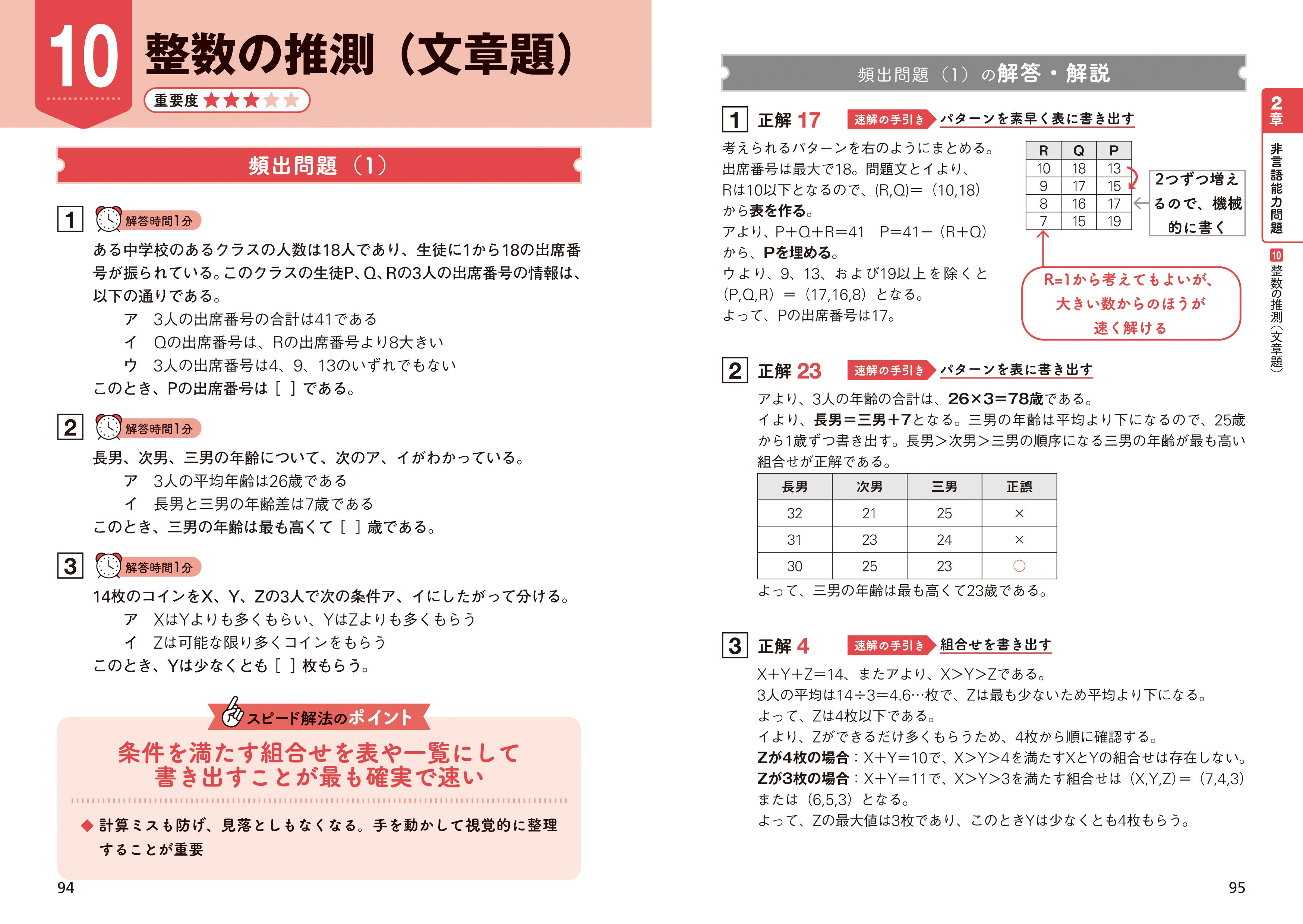 多くの方が苦手にされている非言語能力問題を中心に解説しています。特に、出題頻度の高い「推論」に多くのページを割き、解き方をわかりやすく解説しています。