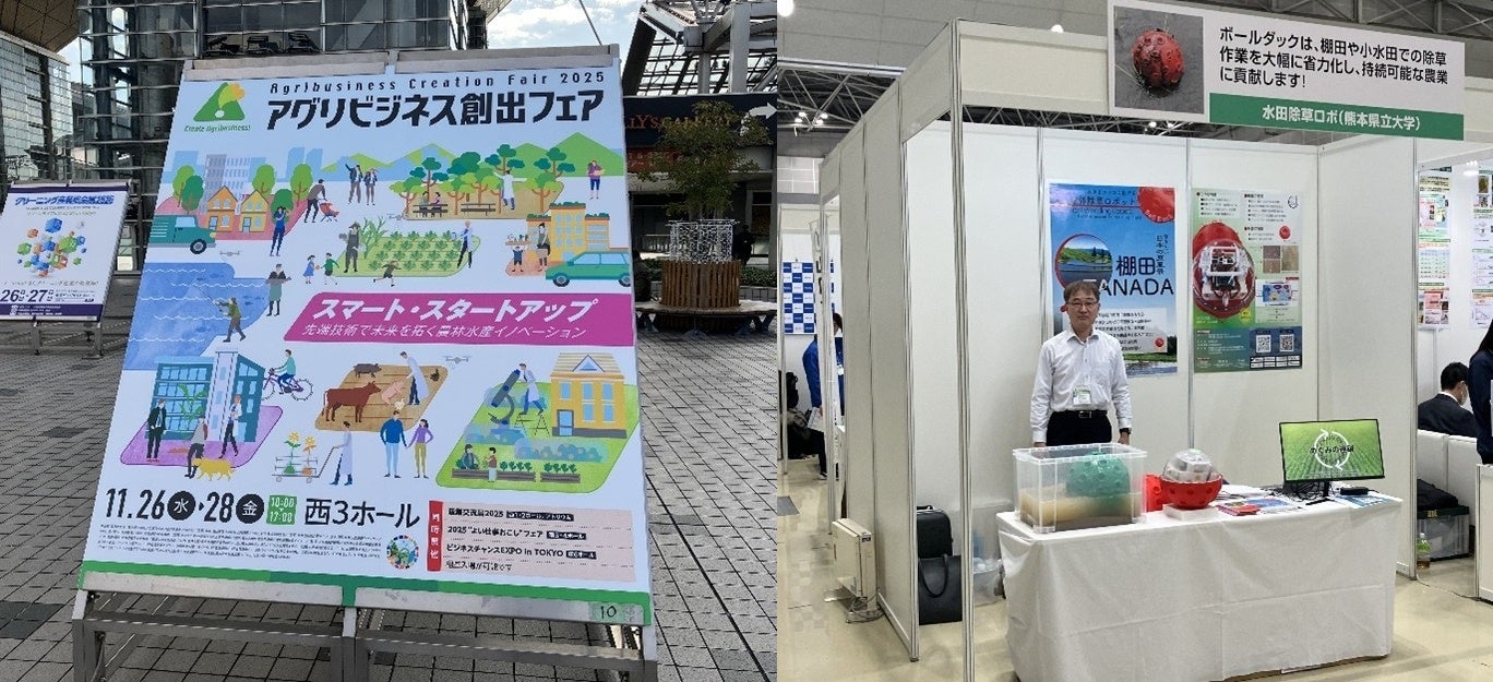 熊本高等専門学校(熊本県八代市・合志市 校長:高松 洋 以下「熊本高専」)は令和7年11月26日(水)~28日(金)に東京ビッグサイトで開催されたアグリビジネス創出フェア2025(主催:農林水産省)に、熊本県立大学(代表機関)等で開発を進めている「棚田や小水田で活躍する球体除草ロボット“ボールダック”」を出展しました。本事業は、熊本県立大学を代表機関とするコンソーシアムで進めており、「戦略的スマート農業技術の開発・改良」の支援により実施しています。