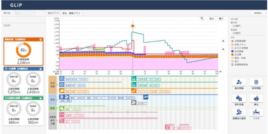 (*)GLiPとは、理想的なライフプランの実現に向け、収支シミュレーションを可視化できるライフプラン分析システムです。当社が、長らく蓄積してきたライフプランナーのコンサルティングノウハウとライフプランデータをもとに、お客さまごとに算出される必要額に対し、資産形成と保障それぞれの準備状況を『充足率』という指標で端的に示し、また目に見えない生命保険や個人年金保険といった保険商品を「形」でグラフィカルに表現しながら、ご提案の内容をわかりやすくお伝えします。