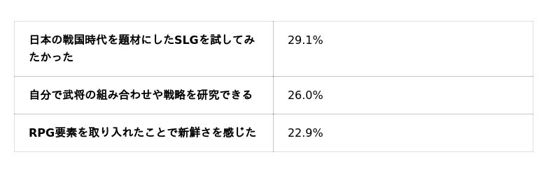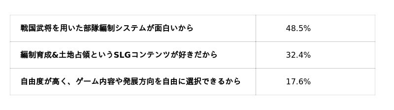 「高く評価している理由」として最も多く選ばれたのは、「戦国武将を用いた部隊編制システムが面白いから」でした。