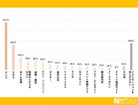 こちらのアンケートも複数回答にていただいております。イルミネーションの情報を知るための情報入手経路についてのアンケートです。一番多かったのは