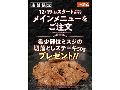 「ステーキのどん富里インター店」にて、2025年12月19日(金)~2025年12月21日(日)の期間限定で、営業再開のお客様感謝企画として、ランチメニューを含むメインメニューをご注文のお客様に、