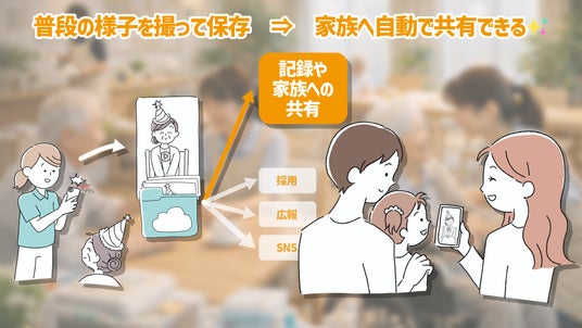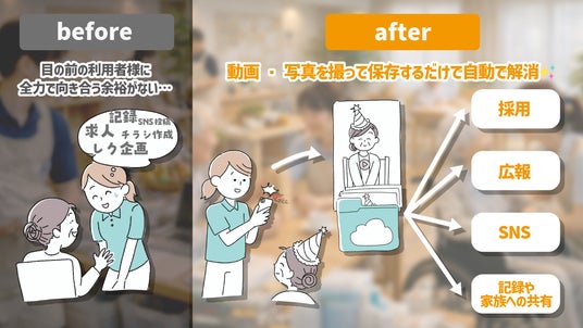 本サービスでは、日常のケアの様子をスマホで撮影・保存するだけで、記録・広報・採用・家族共有までを一気通貫で自動化。