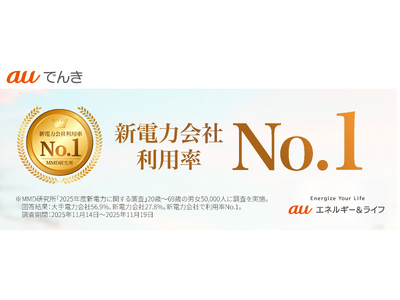 auエネルギー&ライフ株式会社(本社:東京都千代田区、代表取締役社長:齋藤 茂、以下:auエネルギー&ライフ)が提供する「auでんき」は、MMD 研究所が実施した「2025年新電力に関する調査」において、利用している新電力会社で1位を獲得しました。