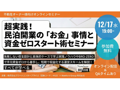 株式会社ブロードエンタープライズ(本社:大阪府大阪市、代表取締役社長:中西 良祐、証券コード:4415、以下、当社)は、Nowhere Group株式会社と共催で、不動産オーナー様向けオンラインセミナーを開催いたします。