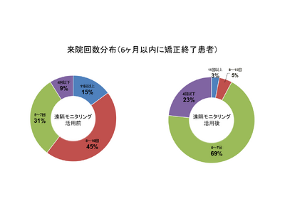 当院において、治療期間が6か月以内で完了した症例を対象に、遠隔モニタリングの活用有無による来院回数を比較したところ、