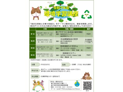 市では、市民の皆様に環境保全に関する理解を深め、環境に配慮した行動を促すべく、毎年、環境学習講座を開催しています。本年は、「身近な環境と企業の取組み」をテーマとして、地球温暖化防止や持続可能な社会の実現に向けて市内や県内で活動されている企業・団体の方を講師に招き、全4回の講座を実施します。