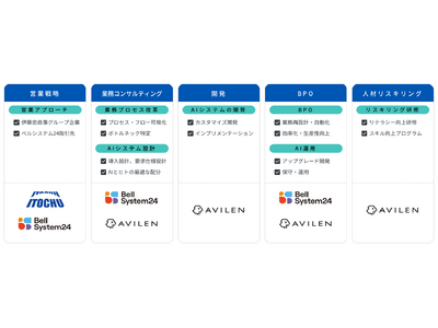株式会社AVILEN(本社:東京都中央区、代表取締役:高橋 光太郎、以下「AVILEN」)は、株式会社ベルシステム24(本社:東京都港区、代表取締役 社長執行役員:梶原 浩、以下「ベルシステム24」)、伊藤忠商事株式会社(本社:東京都港区、代表取締役社長COO:石井 敬太、以下「伊藤忠商事」)と業務提携契約(以下「本提携」)を締結し、AIエージェントのオーダーメイド開発、実装、AI人材へのリスキリング、BPOを包括的に支援するソリューションの提供を開始しました。これにより、AIソリューションの導入や部分的支援にとどまらず、企業ごとの業務プロセスや課題に応じた最適な支援が可能になります。