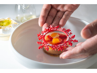 フレッシュな苺と金柑の上に乗るのは、赤い雪の結晶。籏のイメージをデザインに落とし込んで作成したオリジナルの模様です。世界大会のデザートでも繊細な飾りがデザートの美しさをより引き立てました。チョコレートパルフェをベースに柚子クリームやスパイスクッキー、アメチップで仕上げています。華やかな見た目と立体的な味わいをお楽しみください。