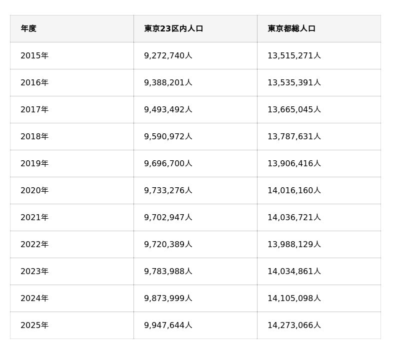 東京23区の人口は10年間で+674,904人(+7.2%)増加、東京都全体の人口は10年間で+757,795人(+5.6%)増加となっていて東京全体でも緩やかな増加が続いており、