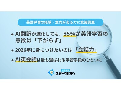 株式会社スピークバディ(本社:東京都中央区、代表取締役CEO:立石剛史、以下「当社」)は、英語学習経験・意向のある国内20代~50代439名を対象に、語学学習に関するアンケート調査(以下「本調査」)を実施しました。