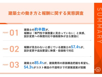 建築市場株式会社(本社:東京都豊島区、代表取締役:天野智弘)は、一都三県で就業する建築士103名を対象に、建築士の働き方と報酬に関する実態調査を実施しましたので、お知らせいたします。