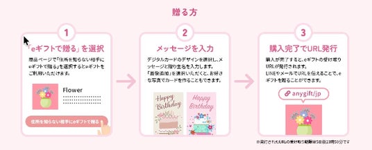 (エニーギフト)』を利用したeギフトサービスを「花キューピット-www.i879.com-」にて開始いたしました。本サービスでは、注文者が贈りたい花を選び、メールやSNSを通じて直接相手にお届けすることができます。住所がわからない相手にプレゼントをしたい場合やお急ぎの際に、より手軽に気持ちを届けることが可能になります。