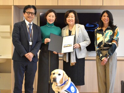 左から、笠原群生院長(成育医療研究センター)、尾見咲來氏(チャイルドバースアカデミー 主催)、ホスピタル・ファシリティドッグ(R)︎マサ(成育医療研究センター)、妹尾理恵氏(冨田勲研究会代表)、キンバリ・フォーサイス(当法人理事長)