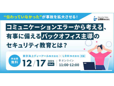 LRM株式会社(本社:兵庫県神戸市、代表取締役CEO:幸松哲也)、東京海上ディーアール株式会社(本社:東京都千代田区、代表取締役社長:水野一幸)は、2025年12月17日(水)11時から、コミュニケーションエラーから考える、有事に備えるバックオフィス主導のセキュリティ教育に関するセミナーを無料開催します。