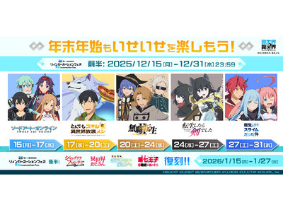 本日2025年12月15日(月)より「1st SEASON」に登場した作品が続々と復刻する「リィンカーネーションフェス」を開催しております。「ソードアート・オンライン」「とんでもスキルで異世界放浪メシ」「無職転生II ~異世界行ったら本気だす~」「転生したら剣でした」「転生したらスライムだった件」「シャングリラ・フロンティア」「異世界おじさん」「転生貴族、鑑定スキルで成り上がる」「転生したら第七王子だったので、気ままに魔術を極めます」が順番に登場する予定です。その他、オリジナルキャラクターたちも新衣装で登場いたします。まずは本日より、第1弾として「ソードアート・オンライン」が復刻し、ガチャにキリト・アスナ・シノン・ユウキが登場しております。