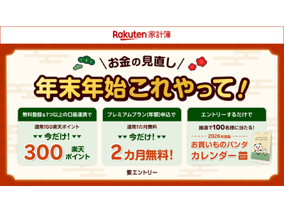 本キャンペーンでは、エントリーをしたユーザーの中から、抽選で100名に楽天の公式キャラクター「お買いものパンダ」の卓上カレンダー(2026年度)をプレゼントします。また、「楽天家計簿」アプリを新規ダウンロードし、1つ以上口座・サービス連携を完了したユーザーを対象に、通常100ポイントのところ、「楽天ポイント」300ポイント(期間限定ポイント)を進呈します。さらに、プレミアムプランの「年額プラン」へ新規で申し込んだユーザーを対象に、利用料が通常1カ月間無料のところ、2カ月間無料で提供します。