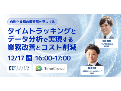 データリテラシーの向上を通じてデータドリブンカンパニーへの変革を支援する株式会社デリバリーコンサルティング(本社:東京都港区、取締役CEO:内藤 秀治郎)は、時間管理ツール「TimeCrowd(タイムクラウド)」を提供するタイムクラウド株式会社(本社:東京都港区、代表取締役:西小倉宏信)と共催でWEBセミナーを開催いたします。