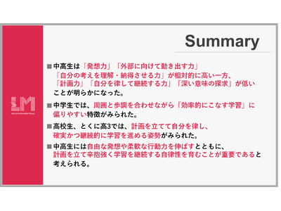 今回の結果から、中高生が持つ発想力や対人面での強みが、周囲と足並みをそろえようとする傾向の強さから十分に発揮されず、推進力や意味探求の低下につながっている点が課題として示唆されました。