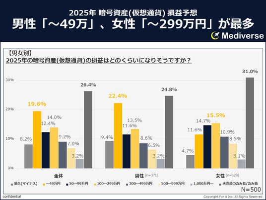 暗号資産口座保有者500名に対して、今年の損益予想を聞いたところ、未売却の含み損益(26.4%)を除くと、もっとも多かったのは「~49万円」(19.6%)となっており、「100~299万円」(14.9%)、「50~99万円」(12.4%)が続いた。