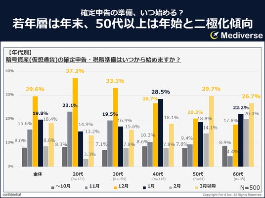 年代別に見ると、確定申告・税務準備開始時期には、年代差が見られた。