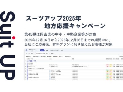 株式会社スーツ(所在地:東京都千代田区、代表取締役社長CEO:小松 裕介)は、「スーツアップ2025年地方応援キャンペーン」第45弾として、岡山県の社員数100名未満の中小・中堅企業、スタートアップを対象に割引キャンペーンを実施いたします。