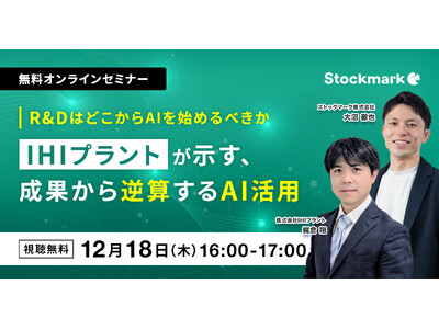 製造業向けAIエージェント『Aconnect』を提供するストックマーク株式会社(以下、「当社」)はオンラインセミナー『R&DはどこからAIを始めるべきか?-IHIプラントが示す、成果から逆算するAI活用』を12月18日(木) に開催致します。