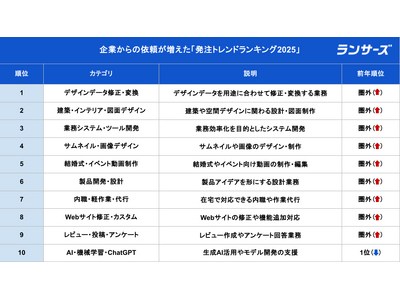 ランサーズ株式会社(本社:東京都渋谷区、代表取締役社長 CEO:秋好 陽介、東証グロース:4484、以下「ランサーズ」)は、ビジネスマッチングプラットフォーム『ランサーズ』において集計した「発注トレンドランキング2025」を12月16日の「フリーランスの日(※)」に公開しました。本ランキングは、今年企業から発注された『ランサーズ』上の仕事を対象に、カテゴリ別の発注数をもとに作成しています。