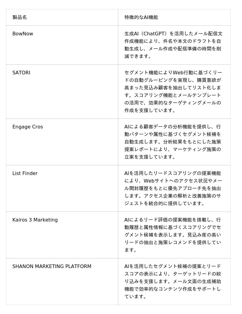 AI機能を持つMAツールは、メール文面の生成やセグメント提案から、配信の自動最適化やキャンペーン自動生成まで、実装レベルが製品によって大きく異なります。本カオスマップは主要31製品を4段階で整理し、各製品がどのレベルまで対応できるかを示しています。「AI機能のレベル」で比較することで、自社のマーケティングニーズに最適な製品を見極める基準がわかります。