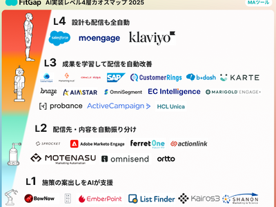 MA市場におけるAI実装は、L1の「施策に使える案を作ってくれる」からL4の「指示だけでキャンペーンが完成」まで大きな幅があります。スタートアップや中小企業ならL1~L2の基本的な自動化で十分な場合が多く、大規模組織で高度なパーソナライゼーションやマルチチャネル施策の自動最適化が必要な場合はL3~L4相当の機能が求められます。また、「AI機能の有無」ではなく「AI機能のレベル」で選ぶ時代が到来しています。自社のマーケティング課題と求める自動化レベルを整理し、最適な製品を選びましょう。製品比較にはFitGapの診断機能をご活用ください。