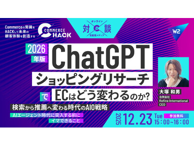 事業形態に合わせたコマースプラットフォームを展開するW2株式会社(本社:東京都中央区、代表取締役:山田大樹、以下W2)は、映像メディア 「Commerce Hack」 にて、"【2026年版】ChatGPT「ショッピングリサーチ」でECはどう変わるのか?検索から推薦へ変わる時代のAIO戦略"をテーマとしたライブプログラムを2025年12月23日(火)15:00より配信いたします。