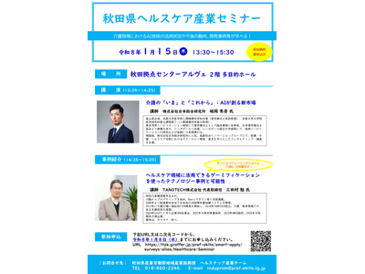 TANOTECH株式会社は、秋田県が主催する「秋田県ヘルスケア産業セミナー」(2026年1月15日開催)において、弊社代表の三田村 勉が講師として登壇し、ヘルスケア領域におけるゲーミフィケーション活用技術の最新動向とその可能性について講演いたします。