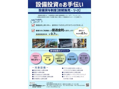 小規模企業(一定の要件を満たす中小企業を含む)や創業者の皆さんが必要とする設備(新品)を、公益財団法人神奈川産業振興センターが購入し、割賦販売又はリースをする制度です。