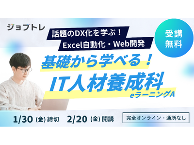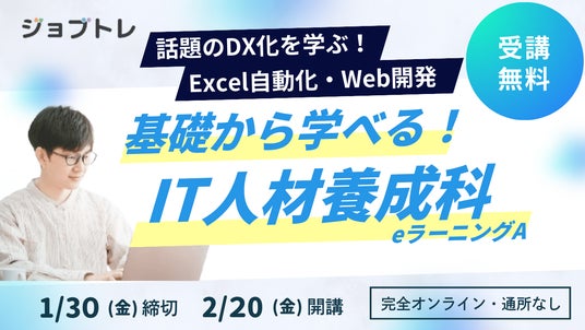 ワークキャリア株式会社(所在地:東京都港区、代表取締役:秋吉 正樹)は厚生労働省から認定を受けているeラーニング型の求職者支援訓練にて、2月20日(金)より開始する「基礎から学べる!IT人材養成科(eラーニングA)」の受講生を募集します。このコースでは、Excelの自動化を図れるマクロ・VBAを通して、プログラミングの基礎を学んでいきます。