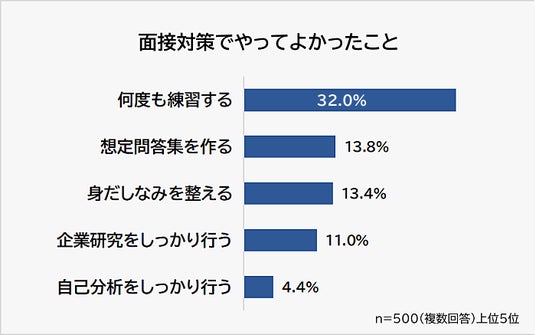 「面接対策でやってよかったこと」を聞いたところ、1位は「何度も練習する(32.0%)」、2位「想定問答集を作る(13.8%)」でした。