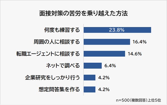 「面接対策の苦労を乗り越えた方法」として最も多かった回答は「何度も練習する(23.8%)」でした。2位「周囲の人に相談する(16.4%)」、3位「転職エージェントに相談する(14.6%)」が続きます。