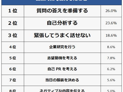 社会人の男女500人に「面接対策で苦労したこと」を聞いたところ、1位は「質問の答えを準備する(26.0%)」、僅差の2位は「自己分析する(23.6%)」でした。